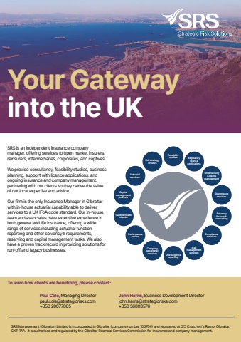 www.gibraltarinternational.com Gibraltar International 13Your Gatewayinto the UKFeasibility studies Regulatory license applicationsUnderwriting & claims managementGovernance servicesSolvency finance & accountingCompliance servicesRisk management servicesDue diligence reportingCompany secretarial servicesPerformance reviewCaptive health checksCapital management analysisActuarial servicesExit strategy reviewsSRS is an independent insurance company manager, offering services to open market insurers, reinsurers, intermediaries, corporates, and captives.We provide consultancy, feasibility studies, business planning, support with licence applications, and ongoing insurance and company management, partnering with our clients so they derive the value of our local expertise and advice.Our firm is the only Insurance Manager in Gibraltar with in-house actuarial capability able to deliver services to a UK IFoA code standard. Our in-house team and associates have extensive experience in both general and life insurance, offering a wide range of services including actuarial function reporting and other solvency II requirements, reserving and capital management tasks. We also have a proven track record in providing solutions for run-off and legacy businesses.To learn how clients are benefiting, please contact:Paul Cole, Managing Directorpaul.cole@strategicrisks.com+350 20077065John Harris, Business Development Directorjohn.harris@strategicrisks.com+350 56003576SRS Management (Gibraltar) Limited is incorporated in Gibraltar (company number 106704) and registered at 5/5 Crutchett%u02bcs Ramp, Gibraltar, GX11 1AA. It is authorised and regulated by the Gibraltar Financial Services Commission for insurance and company management.