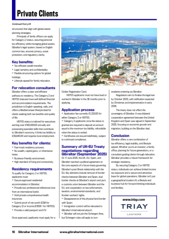16 Gibraltar International www.gibraltarinternational.comstructures) that align with global estate planning strategies.Principals of family offices can apply for Category 2 status, securing personal tax efficiency while managing global assets. Gibraltar%u2019s legal system, based on English common law, ensures privacy, asset protection, and regulatory clarity.Key benefits:%u2022 Tax-efficient wealth transfer;%u2022 Legal certainty and confidentiality;%u2022 Flexible structuring options for global holdings;%u2022 Lifestyle appeal for family relocation.For relocation consultantsGibraltar offers a clear and efficient pathway to residency. The Category 2 and HEPSS statuses have well defined financial and accommodation requirements. The jurisdiction is English-speaking, safe, and offers a Mediterranean lifestyle ideal for clients seeking both tax benefits and quality of life.HEPSS status is tailored for executives earning over %u00a3160,000.00 annually and possessing specialist skills that contribute to Gibraltar%u2019s economy. It limits tax liability to %u00a339,940.00 and requires local employment.Key benefits for clients:%u2022 Fast-track residency process;%u2022 No wealth, capital gains, or inheritance taxes;%u2022 Business-friendly environment;%u2022 High standard of living and connectivity.Residency requirementsTo qualify for Category 2 or HEPSS, applicants must:%u2022 Secure approved residential accommodation in Gibraltar;%u2022 Provide two professional references (one from an international bank);%u2022 Hold private comprehensive health insurance;%u2022 Submit proof of net worth (%u00a32M for Category 2) or income (%u00a3160K+ for HEPSS);%u2022 Provide a valid passport and CV.Once approved, applicants must apply for a Civilian Registration Card. HEPSS applicants must not have lived or worked in Gibraltar in the 36 months prior to applying.Application process%u2022 Application fee currently %u00a31,233.00 for either Category 2 or HEPSS;%u2022 Category 2 applicants once the status is granted are required to deposit an amount equal to the maximum tax liability, refundable when the status is ended; %u2022 Certificates are issued indefinitely, subject to continued compliance.Summary of UK-EU Treaty negotiations regarding Gibraltar (September 2025)On 11 June 2025, the UK, EU, Spain, and Gibraltar reached a political agreement on the core aspects of a future treaty governing Gibraltar%u2019s post-Brexit relationship with the EU. Key elements include removal of border checks between Gibraltar and Spain, dual border checks at Gibraltar%u2019s airport and port, a customs union between Gibraltar and the EU, and cooperation on law enforcement, taxation, environmental standards, and frontier workers%u2019 rights.%u2022 Disappearance of the physical land border with Spain; %u2022 Immigration control will be relocated toGibraltar%u2019s International airport; %u2022 Gibraltar will not join the Schengen Area, but Schengen rules will apply to nonresidents entering via Gibraltar; Negotiators aim to finalise the legal text by October 2025, with ratification expected by Christmas and implementation in early 2026. The treaty does not affect the sovereignty of Gibraltar. A new bilateral cooperation agreement between the United Kingdom and Spain was signed in September 2025, focusing on economic growth and migration, building on the Gibraltar deal.ConclusionGibraltar offers a rare combination of tax efficiency, legal stability, and lifestyle appeal. Whether you%u2019re an investor, a family office, planning for future generations, or a consultant guiding clients through relocation, Gibraltar provides a robust framework for strategic residency.By securing Category 2 or HEPSS status, individuals can achieve limited income tax exposure and a secure and attractive base for global operations. Gibraltar isn%u2019t just a geographical location it%u2019s a lifestyle and business hub for forward thinking individuals and families.Private Clientswww.triay.comContinued from p14