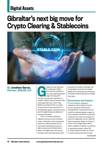 18 Gibraltar International www.gibraltarinternational.comGibraltar%u2019s next big move for Crypto Clearing & StablecoinsBy Jonathan Garcia, Partner, ISOLAS LLPDigital AssetsContinued p20Gibraltar has never shied away from being bold. In 2018, it became the first jurisdiction in the world to regulate Distributed Ledger Technology (DLT). That early move earned it a reputation as a jurisdiction willing to embrace innovation while ensuring guardrails were in place. Today, Gibraltar is pushing the frontier once again. The government has announced plans for a groundbreaking regulatory framework that will govern the digital clearing and settlement of virtual asset derivatives.This is no small step. Clearing and settlement sit at the very heart of financial markets. Traditionally, central counterparties play this role, reducing systemic risk and ensuring that trades between buyers and sellers are executed and finalised without dispute. In the digital asset world, however, this safety net has been largely absent. Most transactions have relied on exchanges, with varying degrees of security and oversight. Gibraltar aims to fill this gap with a framework that brings institutional standards to the digital asset space.Government and IndustryThe new framework, developed in collaboration with the Gibraltar Financial Services Commission (GFSC) and the exchange Bullish, is being positioned as the world%u2019s first dedicated regulatory regime for crypto clearing and settlement. It will provide a roadmap for how risks are managed, how assets are safeguarded, and how settlement finality is guaranteed. Minister for Trade and Industry, The Hon Nigel Feetham MP KC, called it a reflection of Gibraltar%u2019s commitment to %u2018responsible innovation.%u2019 Bullish CEO Tom Farley praised the initiative as a model for public%u2013private partnership done right,
