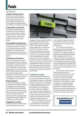 24 Gibraltar International www.gibraltarinternational.com1. Integrity and ethical conduct:Directors must act with honesty and prioritise the best interests of the fund and its investors above all else. This includes adhering to the duties of skill, care and diligence and upholding fiduciary responsibilities to act loyally and in good faith.2. Independence and objectivity:The presence of independent directors in board discussions and strategic and operational decision brings an objective perspective to the firm and ensures that management decisions and the fund%u2019s strategic direction align with investor interests.3. Accountability and transparency:As per Gibraltar%u2019s Funds legislation, Directors are ultimately responsible for overseeing a fund%u2019s operations and performance and managing the risks associated with its investment strategy. They must therefore be transparent in their communications with investors.4. Competence and experience:Effective corporate governance requires skilled and experienced directors who have the knowledge to thoroughly understand the fund%u2019s operations and add value to them, assess risk effectively, and make informed, strategic decisions. For crypto funds, this should include a foundational understanding of the relevant technology and the maintenance of a robust control environment, including effective cybersecurity measures and due diligence on service providers.5. Risk management:An effective risk management framework is a strategic tool. By proactively identifying and mitigating risks and keeping a close eye on market developments (specifically in the crypto space), directors can protect investors and enhance the fund%u2019s resilience in the face of market uncertainty. For crypto funds, directors should also assess and mitigate risks specific to digital assets including custody and cybersecurity.6. Segregation of authority:A critical but sometimes overlooked aspect of sound corporate governance is the segregation of financial authority. According to the Corporate Governance Code for Gibraltar Collective Investment Schemes (Section 11.4B), at least two regulated/authorised signatories must approve any transfer of a fund%u2019s assets or cash to third parties, including service providers. No single individual should ever hold sole control over a fund%u2019s accounts. Requiring dual or multiple signatories for material transactions is one of the most effective internal control measures available to protect investor assets and prevent misuse of funds. Implementing multi-signatory approval not only reduces operational and fraud risk but also demonstrates a fund%u2019s commitment to transparency and disciplined stewardship of investor capital.Long term successThe corporate governance structure at a fund is a dynamic framework that guides a fund throughout its lifecycle. From the outset, directors play a crucial role in establishing a strong and strategic governance foundation by defining the board composition and ensuring that the fund%u2019s marketing and promotion complies with all regulations and restrictions that apply to different fund types. Directors are also responsible for the contents of the fund%u2019s offering document where the fund%u2019s strategy must be clearly articulated, providing investors with transparent and comprehensive information.As such, most corporate governance happens well before a fund is launched. It%u2019s all in the structure. This early-stage work is critical as it embeds the values of accountability, transparency and investor protection into the fund%u2019s operations from before day one.Once a fund becomes operational, governance naturally evolves. Regular board meetings (ideally conducted quarterly) provide a forum for ongoing oversight, risk assessment and strategic decision making. When challenges arise at the fund, the directors must adopt a proactive approach in seeking information and taking necessary action including monitoring the funds liquidity and communicating with the regulator where necessary. Ad-hoc board meetings must also be convened where strategic decisions need to be made.This commitment to sound corporate governance fosters a culture of accountability and transparency at a fund and directly contributes to its long-term success. It is our view that corporate governance should not be seen as a cost of doing business, and in Gibraltar, it is rather recognised as a competitive advantage. Our approach is that sound corporate governance is a strategic asset that drives performance, attracts the right investors and enhances the reputation of the jurisdiction and the financial services it has to offer.FundsContinued from p22www.gibraltarlaw.com