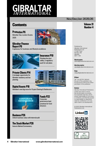 Promotion P6Gibraltar Day London Events 2025 Gibraltar Finance Report P8A gateway for business and lifestyle excellenceInsurance P10Shutting the door safely, a regulatory push for exit plansPrivate Clients P14A strategic opportunity for Gibraltar residency and tax planningDigital Assets P18Gibraltar%u2019s next big move for Crypto Clearing & StablecoinsFunds P22Corporate governance best practices for fund directorsBusiness P26Unlock business value with internal auditThe Stock Market P28Autumn Market Commentary4 Gibraltar International www.gibraltarinternational.comPublished by Gibraltar InternationalPublications Ltd71 Irish TownPO Box 395GibraltarGX11 1AAEditorial enquirieseditor@gibraltarinternational.comAdvertising enquiriessales@gibraltarinternational.comDesign design@gibraltarinternational.comUK Agent Tel: +44 (0)7791 563442No part of this publication may be reproduced without the written permission of the publishers. DisclaimerGibraltar International Publications Limited have tried to ensure that all information is accurate, but emphasise that they cannot accept responsibility for any errors or omissions, and that they accept no responsibility for statements made by contributors or for any claim made in an advertisement.%u00a9 2025 Gibraltar International Publications Ltd.ContentsNov/Dec/Jan 2025/26Volume 31Number 4INTERNATIONAL