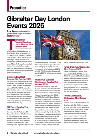 6 Gibraltar International www.gibraltarinternational.comGibraltar Day London Events 2025The Gibraltar Financial Services Lunch, Monday 20th October 2025 A return to Mansion House, the official residence of the Lord Mayor of the City of London. Drinks will be served from 12.30 PM to 1.00 PM, followed by a seated three course lunch held in The Egyptian Hall, concluding at 3.00 PM. The lunch will be hosted by the Chief Minister, Fabian Picardo, and the Minister for Financial Services, Nigel Feetham. The event will offer a valuable platform for dialogue, insight, and networking among senior representatives from across the financial services sector.Insurance Breakfast, Tuesday 21st October 2025This years insurance event will be held in The Auditorium at DAC Beachcroft, The walbrook Building, London, EC4N 8AF. Registration is between 8.45 AM to 9.00 AM, followed by a Buffet Breakfast, with the main event starting at 10.00 AM. The event will be attended by senior representatives from the industry, government, and regulatory bodies, followed by a panel discussion, and concluding with a networking opportunity. Attendance is by confirmed reservation only.DLT Event, Tuesday 21st October 2025Also to be held in The Auditorium, DAC Beachcroft, in the heart of the City. Minister for Financial Services, Nigel Feetham, along with industry experts, government, and regulatory bodies, will be presenting the latest from the Distributed Ledger Technology sector. Registration, light bites and refreshments between 12.30 PM and 1.00 PM, followed by a keynote and panel discussion. A networking opportunity, light bites and refreshments, will be held between 2.00 PM and 2,30 PM. A further panel discussion will be held at 2.30 PM, with the event concluding at 4.30 PM.#GIBLDN25 Business Conference, Tuesday 21st October 2025A first for the Gibraltar Day Events, the business conference will be held in the OXO Tower, on the South Bank, London, SE1 9PH.Sponsored by Gibraltar companies including Hassans International Law Firm, ISOLAS LLP, TTMS, GibFibre, BMI Group, Callaghan Insurance, and many others, the conference will begin at 5.00 PM with various Podcasts on Gibraltar Business, Tax, Gibraltar Business and lifestyle. A break for refresments will be held for an hour at 6.15 PM. Minister for Health, Care and Business, Gemma Arias-Vasquez will be delivering the Keynote Speech at 7.15 PM, followed by a Fireside Chat with the Chief Minister, Fabian Picardo, Attorney General, Michael Llamas, and Peter Montegriffo, KC to discuss the UK / EU Treaty business opportunities. A networking opportunity, with drinks and canap%u00e9s, will begin at 8.00 PM, with the conference concluding at 9.00 PM.Funds Breakfast, Wednesday 22nd October 2025A return to the prestigious, historic, Royal Automobile Club (RAC), 89 Pall Mall, London, SW1Y 5HS. Arrival is at 8.45 AM, with a Buffet Breakfast at 9.00 AM, followed by the main event in the Mountbatten Room at 10.00 AM. Senior representatives from the industry, government, and regulatory bodies, will be presenting the latest from the funds sector.Attendance is by confirmed reservation only, with strict business attire.Private Client Lunch, Wednesday 22nd October 2025Also to be held in the Mountbatten Room, The Royal Automobile Club (RAC), in the heart of St. James, South West London. Guests arrive at 12.45 PM, with a Buffet Lunch at 1.00 PM, and the main event starting at 2.00 PM.Senior representatives from the industry, government, and regulatory bodies, will be presenting the latest from the Private Client Sector. Attendance is by confirmed reservation only, with strict business attire.Tony Alan reports on this years three days business sector eventsPromotion